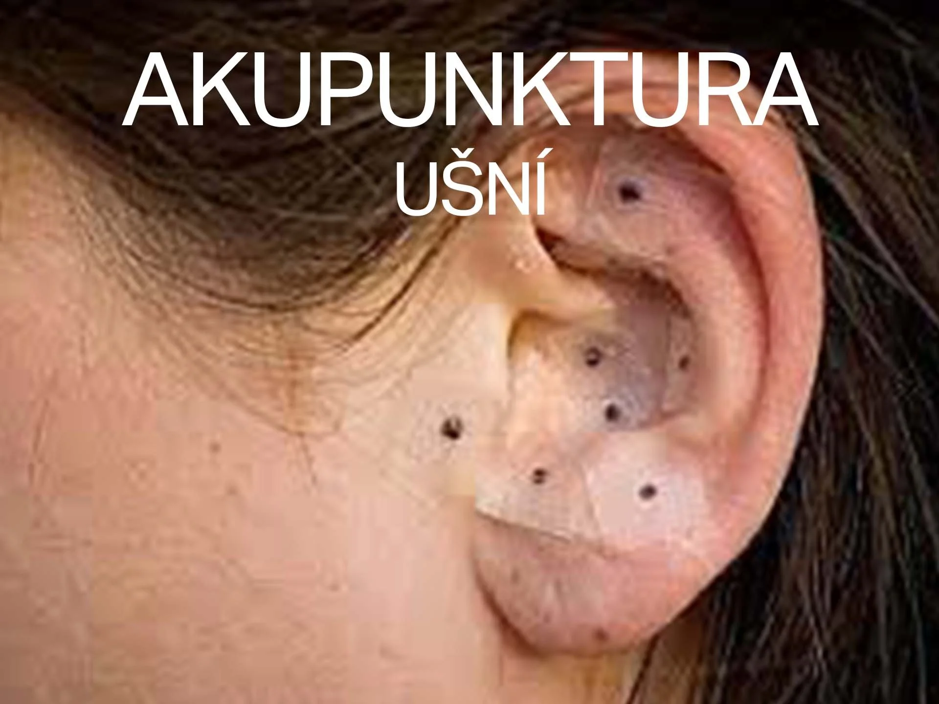 Close-up of a person's ear with multiple acupuncture points marked with black dots and overlaid with the text 'AKUPUNKTURA UŠNÍ'.